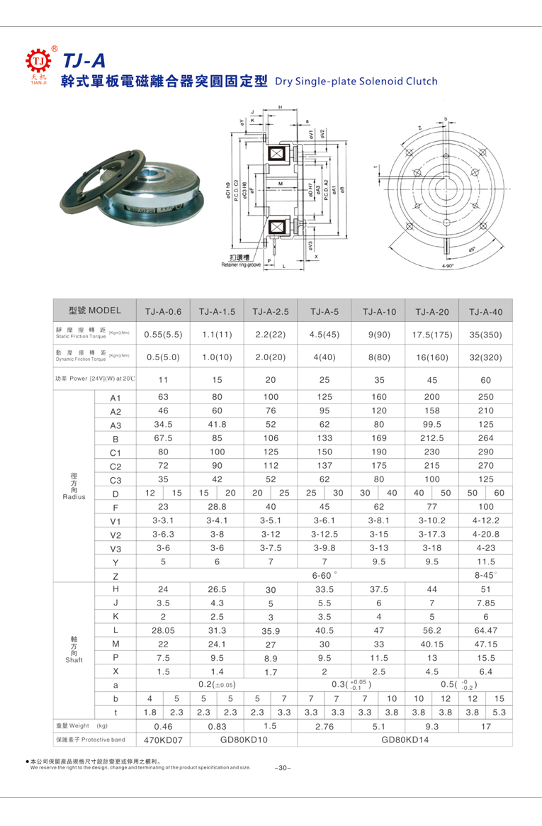 直流24V電磁離合器(干式單板電磁離合器)型號(hào)選型參數(shù)表如下:
