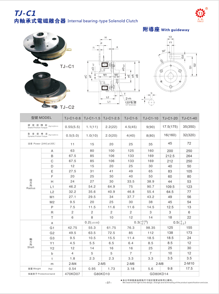東莞天機(jī)傳動(dòng)(臺(tái)灣天機(jī)牌)電磁離合器生產(chǎn)廠家制造銷售內(nèi)軸承式電磁離合器(掛鉤式電磁離合器),對應(yīng)的型號(hào)是TJ-C2,電磁離合器線圈通電時(shí),在電磁力的作用下,將主動(dòng)轉(zhuǎn)子與從動(dòng)轉(zhuǎn)子連接在一起,主動(dòng)端與從動(dòng)端同時(shí)轉(zhuǎn)動(dòng),電磁離合器處于閉合的狀態(tài)。