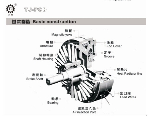 電極、制動軸套、磁軛、制動軸、軸承、散熱片、定子、后蓋這些部分構成;